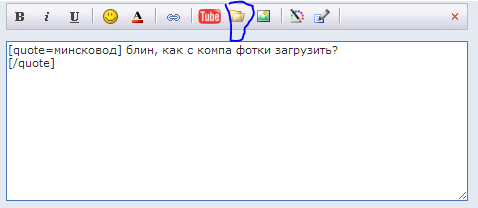 ну вот же в рамке где текст пишешь иконка картинки зеленая на нее жмешь потом по одной грузишь потом в новом окне том тыкаешь на свои фото сюда добавятся сылки -------------------- 25366 |