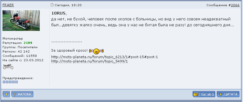 И, будто в память о старой доброй девятке, его репутация сложилась в виде цифр "2109"... Цитата: 10RUS права обязательно получу Ну это хорошо. А с документами на Иж проблем особых нет. У нас в России столько Ижей... Много где можно найти очень дёшево (пару тысяч) какой-нибудь убитый в хлам Иж с доками, переписать на себя и поставить с него раму на свой мот. У нас в соседнем городе продают Юпитер 3 убитый, но на ходу, с документами за 1500 рублей. Мой друг его скоро купит и перекинет раму на свой Юпитер 3. Цитата: 10RUS не поверишь сколько еще с ижом старым отдали бесплатных советских(новых) запчастей жаль не было коленвалов . Даааа, это круто! Я сам являюсь счастливым обладателем кучи Советских запчастей с пробегом всего 1500 км, купил их за 200 рублей! Среди них: маятник, заднее крыло, пульты руля, задний барабан с кожухами, руль, немного мятое переднее крыло, вилка мятая (на ней врезались) и многие другие запы. А коленвала у нас в гаражах один дедок продаёт за 500 рублей, новые СССР в смазке. Вот пока ещё не могу с ним связаться. Цитата: FRAER Обращения можно делать на кнопку "цитата" А если выделить часть текста и нажать на эту кнопку, то получится вот такая Цитата: FRAER цитата -------------------- В любой непонятной ситуации - капиталь двигатель! © parfent |