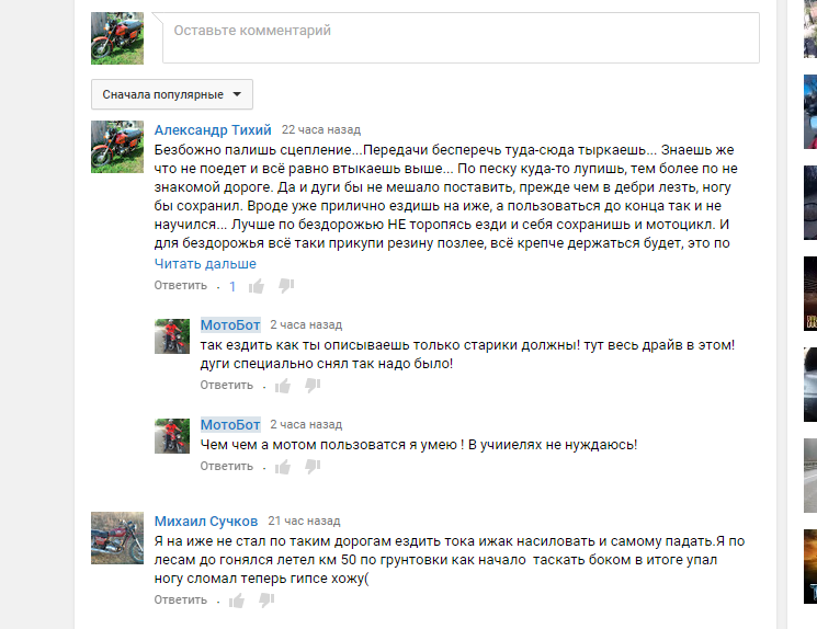 lex122, Цитата: FRAER Я значит старик... А под драйвом он видимо понимает расх у ярить мот и себя? Да и какой человек любит и принимает критику... Ох уж эти блогеры-хуёгеры... Вот что что а я по по дебрям за свою жизнь поболее его полазил и знаю о чём говорю. Вот когда окажется придавленным мотоциклом, тогда поймёт что значит дуги))) Да не поймёт он, почему это вдруг мотоцикл взял и придавил его! Цитата: Vladimir AN)) Александр Вы слишком близко принимаете к сердцу всякую куйню из КоНтАктов всяких. ++ Цитата: Vladimir AN)) Вообще многое зависит от темперамента человека. Даже автомобиль люди водят по разному хотя учили одинаково. Так что спор ваш не стоит выеденного яйца ИМХО Согласен! Лично знаю человека, который уже более 20 лет за рулём разных автомобилей. И он всегда ездит, как дьявол Цитата: FRAER Да и он дядя не маленький а мотоцикл удержать не может. Я с бараним весом до хруста в коленках держу, лишь бы не упасть, а тут будто в радость... Саня, забей. -------------------- В любой непонятной ситуации - капиталь двигатель! © parfent |