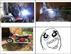 Цитата: FRAER Я вот не понимаю почему многие писают кипятком от воздушных вилок и литья? А я знаю почему. Вам пятьдесят лет продают одно и тоже, а потом на! литье и пневмовилка с дисковым тормозом. И вы хватаете не глядя Я тоже думал что это мегакруто, потом спокойно подумал - спицованное колесо мягче, не дефицит, взаимозаменямые, колодочные тормоза тоже тормозят нормально, а не клинят при передозировке усилия на песке. А предлагаемое литье, ИМХО, ИЖу по стилю не подходит. Цитата: Skampf мне больше интересно как это говно без доков стоит 15к вот Этого хмыря лично знаю, у него несколько гаражей с совками, сейчас расхламляется и покупает более старые экземпляры 50-кубовых мопедок. Брал у него 40-летний Ю3 с доками в офигенном состоянии по адекватной цене - 13 к. И та трешка была в тыщу раз лучше этой ржавой двойки. Во, настоящая! И. Растеряев "Песня о детстве" https://youtu.be/fIzuNHm4lng Сообщение отредактировал Me and motorcycle - 25 сентября 2015 23:08 -------------------- Тот, кто едет на японце, всё сделал правильно - накопил, выбрал и купил. А тот, кто едет на совке ВСЁ СДЕЛАЛ ПРАВИЛЬНО! Не меняй свой Юпитер на Харлей Девидсон! |