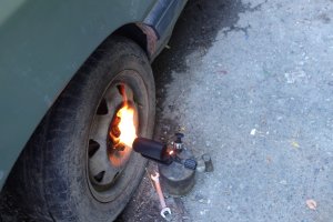 Цитата: Skampf А то у меня весы домашние только от 20кг работают) Они электронные? Поставь на них картер, потом встань, чтобы они заработали и слезь. После этого они покажут вес картера, даже если он меньше 20 кг. Цитата: fedorkamkin В данный момент занимаемся подбором домена (адреса сайта) Берите moto-planeta.su. Мы уже обсуждали это раньше) Нужно, чтобы название сайта осталось тем же - Мото Планета, чтобы люди через поисковик выходили на нас. Молодцы, что действуете! Цитата: lex122 по случаю купил второй грузовой юпитер водянка 2000 года Как так, грузовой Иж - это ж редкость, а у тебя их уже целых два! Цитата: МК Драть сцеплением= по тупому ЛОМАЮТ машину, таким способом можно не только гайку сорвать, а: - оборвать шрус - ступицу диска сцепления - разорвать демпфер на диске сцепления - оборвать вал в КПП - обломать зуб шестерни. - Раскрошить подшипник. Считаю, что плохих последствий на моей машине быть не может. Демпфер диска сцепления и так у меня убитый, бывает схватывает с рывками, это ещё до меня было. Шрус, ступицу диска сцепления и прочие детали сломать, я считаю, не может! Узлы автомобиля сделаны с запасом, с расчётом на большие мощности, на некоторых таких Ауди установлен двигатель 160 л. с. Сопротивление, которое создаёт ключ и закисшая гайка - ничтожно. То есть теоритически, если бы ключ был бы сверхпрочным и не слетал с гайки, то при кидании сцепления гайка бы открутилась, а двигатель этого даже почти не заметил. Расскажу, что сегодня я делал! Я купил за 200 рублей две бензиновые паяльные лампы. У одной оказался неисправен насос, но работал распылитель. Короче собрал из двух одну, залил бенза, прогрел, зажёг горелку. Форсунка оказалась не очень хорошая и работала с перебоями - в итоге мне не удалось добиться синего пламени. Попробовал прогреть гайку: До красна она естественно не нагрелась. Лишь только закоптил всё. Потом поробовал открутить её с помощью рычага из длинной трубы - нихрена. Завёл машину, упёр хорошенько рычаг, включил передачу, плавно отпускаю сцепление - уходит в пробуксовку колесо на другой стороне машины. Кинул сцепление на холостых оборотах - раздался хруст. Итог - ключ сломало нахрен. В общем гайку открутить никак не получилось, и был предпринят альтернативный вариант - снять всё целиком, вместе с приводом. Снял: Стойку привёз домой: Что ж, буду пытаться с ней что-то сделать, может как-нибудь да получится открутить эту гайку... -------------------- В любой непонятной ситуации - капиталь двигатель! © parfent |