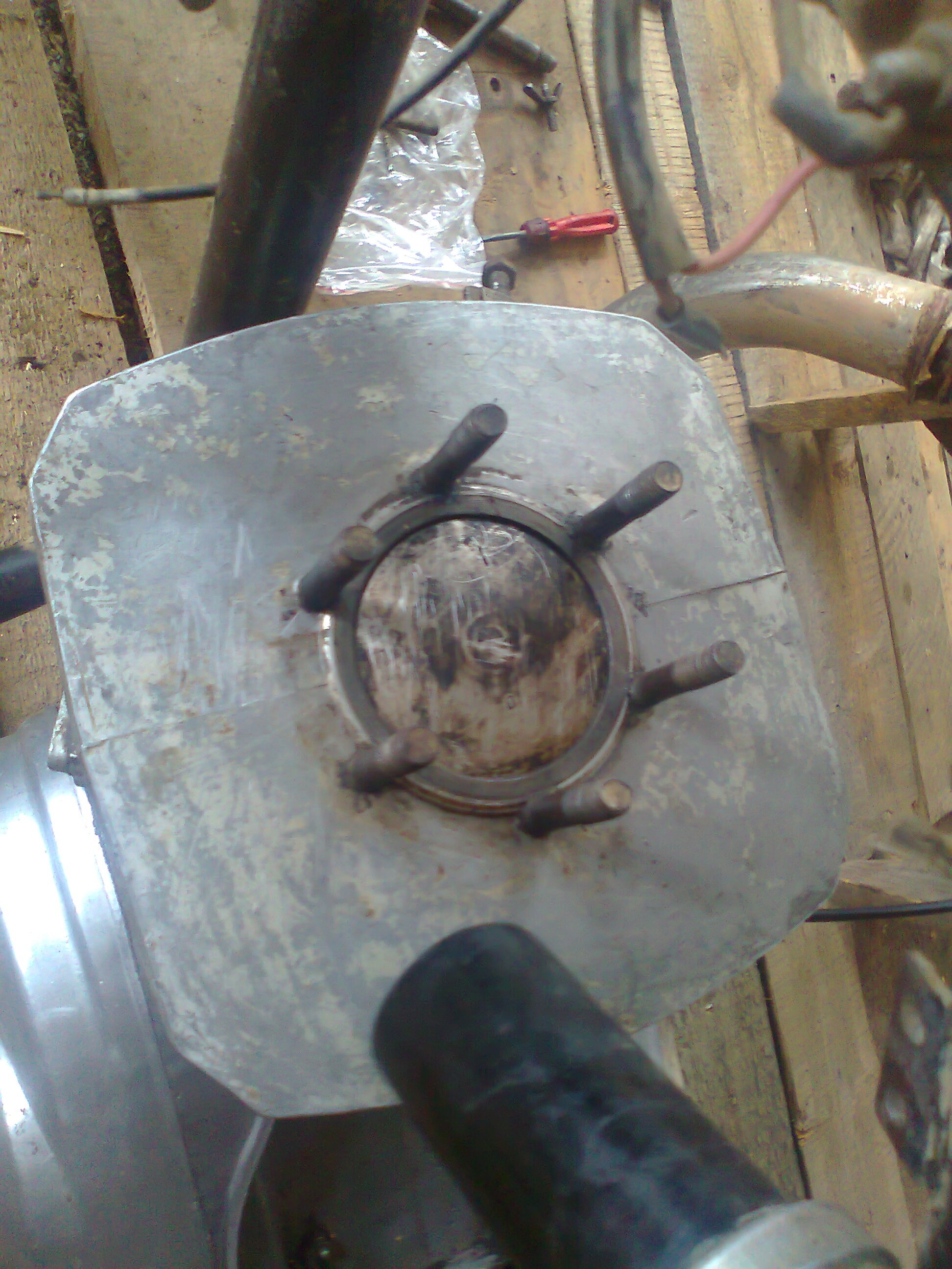 За основу взято днепровское колесо. Со ступицы срезаны бурты в которые вставляются спицы. Выточена стальная втулка в диаметр и насажена на ступицу. взяты родные-же обода, отрихтованы как вышло (по моему мнению, выровнить Ураловские или Днепровские обода в ноль практически невозможно. 3мм, но бьёт) и приварены к втулке пятью стальными лучами-спицами. Здоров! Поясни про колесо. Днепровская ступица сталеалюминиевая - тормозной барабан железный, венец с ребрами охлаждения и буртами под спицы люминь.Это получается они обточили алюминий не полностью и одели стальную втулку? Или под ноль сточили все алюминиевое?