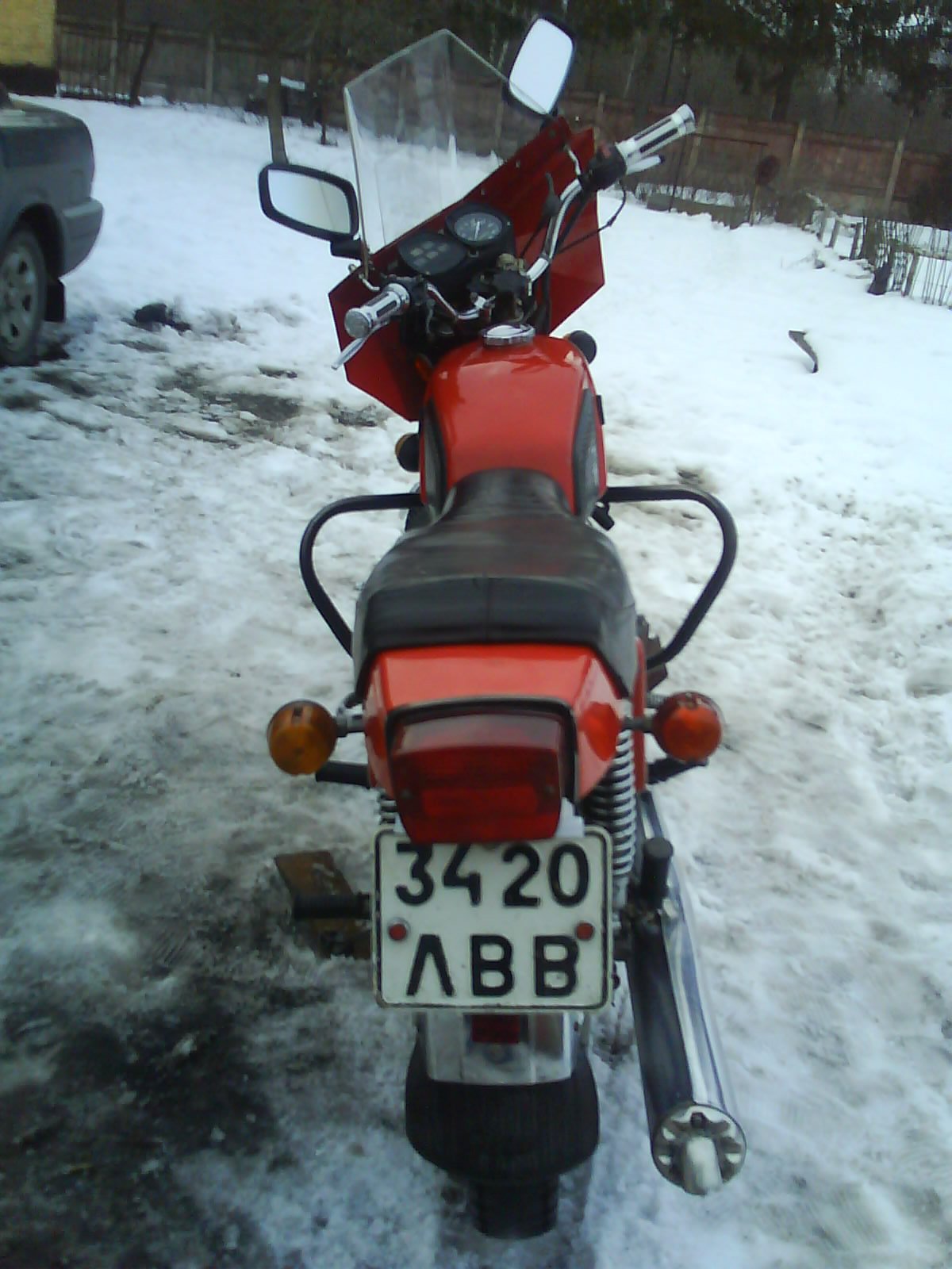 (лучше бы родной цвет оставил) из косяков не работает вся электроника, быстро разряжается аккумулятор, нет тросика переднего тормоза и колодок, стучит палец, нет тросика спидометра, отпадывают колени глушителей (так как глушители Ю5) из за этого громко орет, очень высокие холостые обороты.